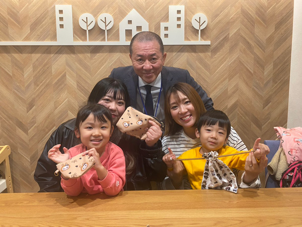 子供を連れての訪問時には、お菓子や動画、三又さんのギャグなどで楽しませて頂き、おもちゃ屋さんに遊びに行くような感覚でした。また、社長の奥様から頂いたポーチもとても気に入っており、毎日肌身離さず使わせて頂いております。